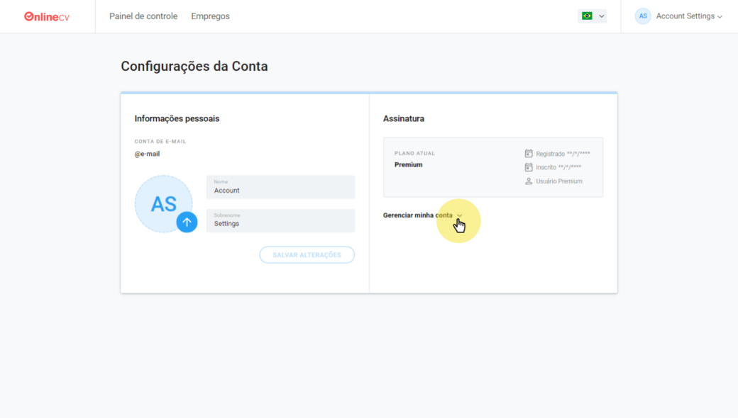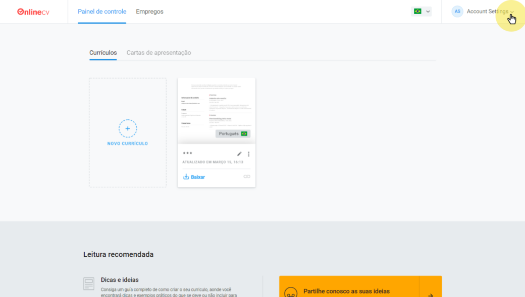 Clique o botão de “Configurações” no menu do canto direito superior para acessar sua conta com todas as suas informações.