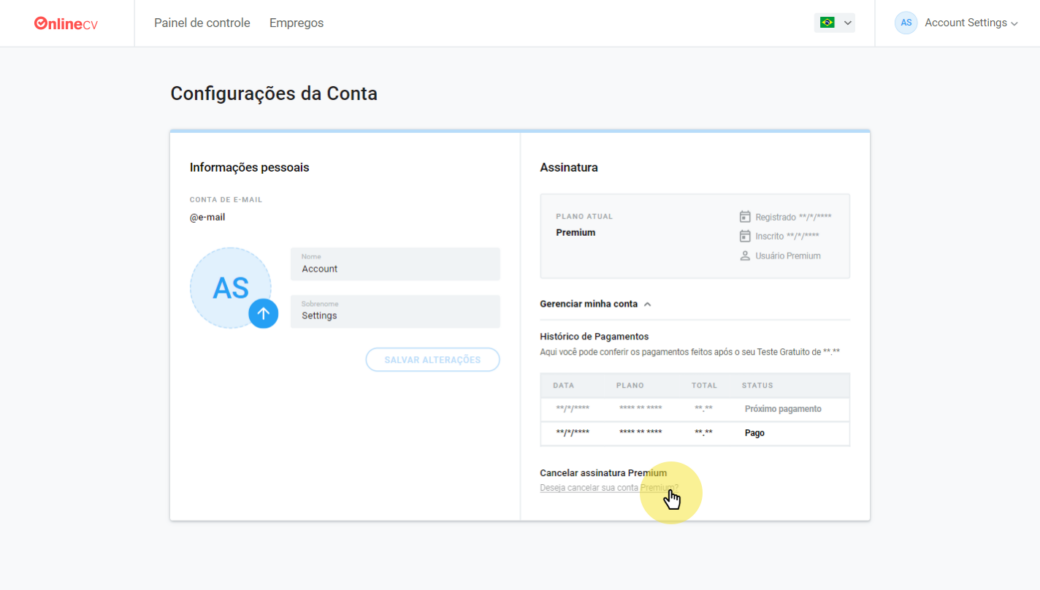 Abaixo da tabela que mostra os diferentes tipos de planos de assinatura do OnlineCurriculo, está a opção de cancelar a inscrição. Clique no botão para concluir.
