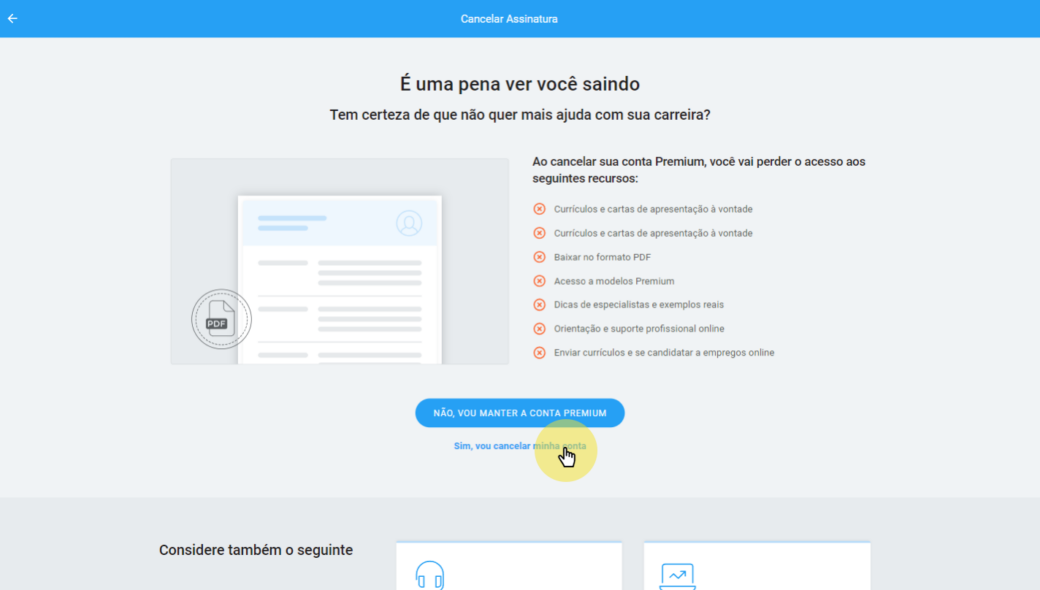 Isso vai te levar até a página de cancelamento da inscrição, que irá te lembrar de baixar seus currículos atuais antes de cancelar. Aqui você pode clicar em “Sim, eu desejo cancelar minha inscrição” para cancelar ou retornar para seus currículos.