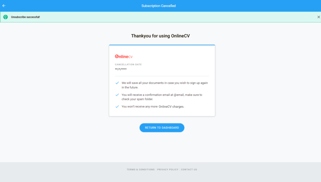 Obrigado por utilizar o OnlineCurriculo, lamentamos em ver você partir, mas estaremos aqui sempre que você precisar atualizar seu currículo futuramente!