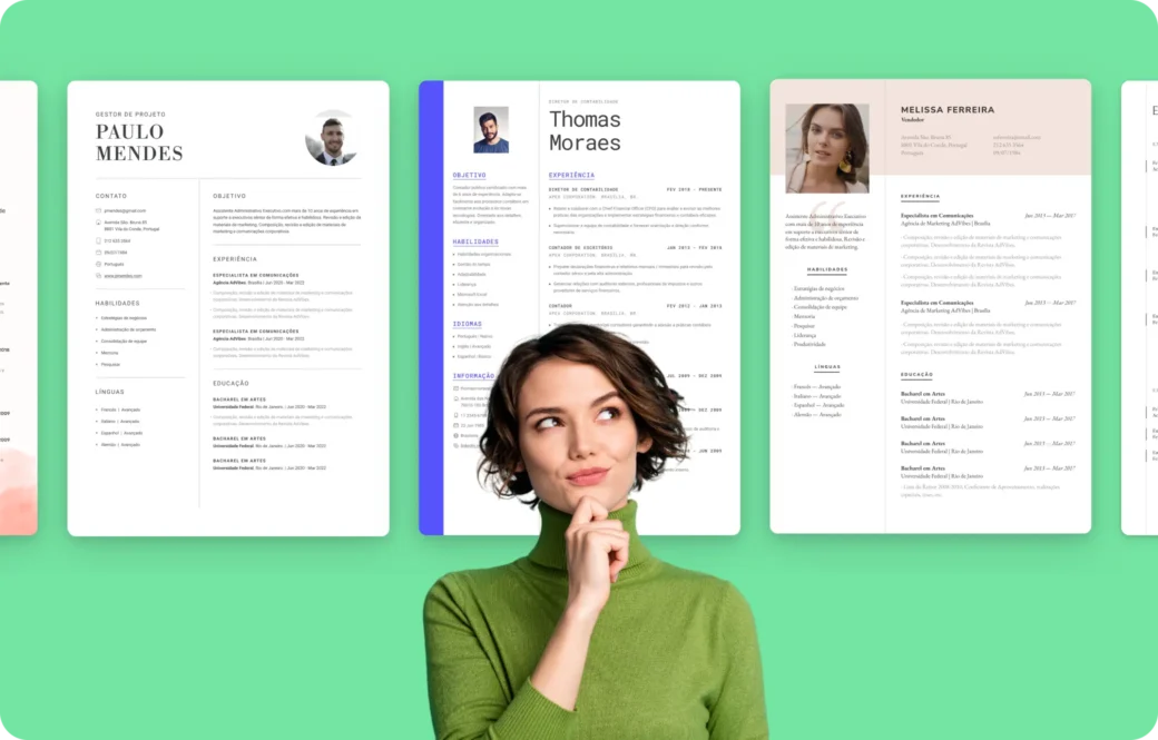 Valorize o seu potencial com o design do seu CV. Veja os modelos de CV para escolher o design mais alinhado ao sei meio profissional e estilo pessoal.
