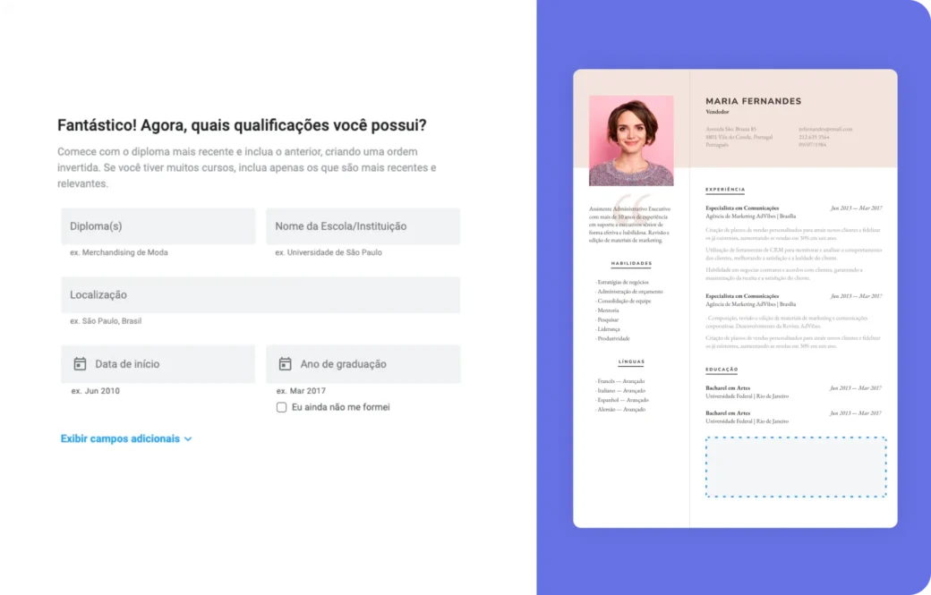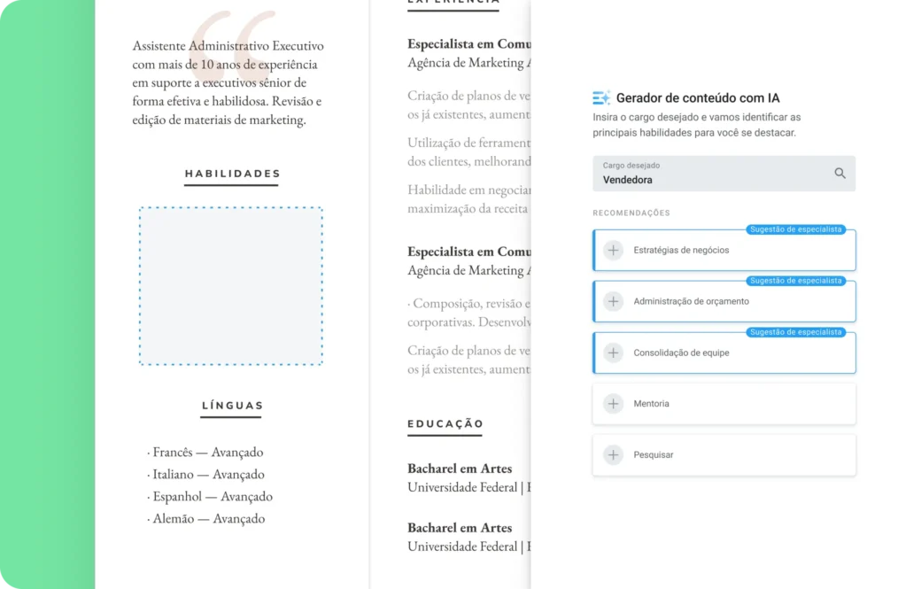 Das habilidades técnicas ao domínio de idiomas, nosso assistente com IA ajuda você a listar as hard skills e soft skills mais alinhadas aos requisitos do emprego de seus sonhos. Se você fala outras línguas, não deixe de especificar qual o seu nível de proficiência.