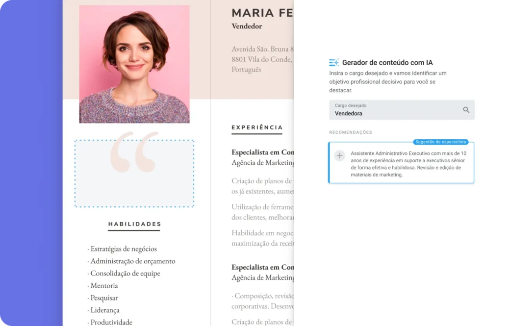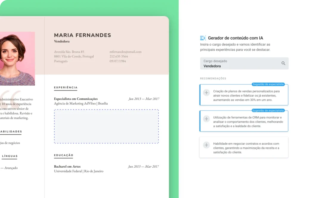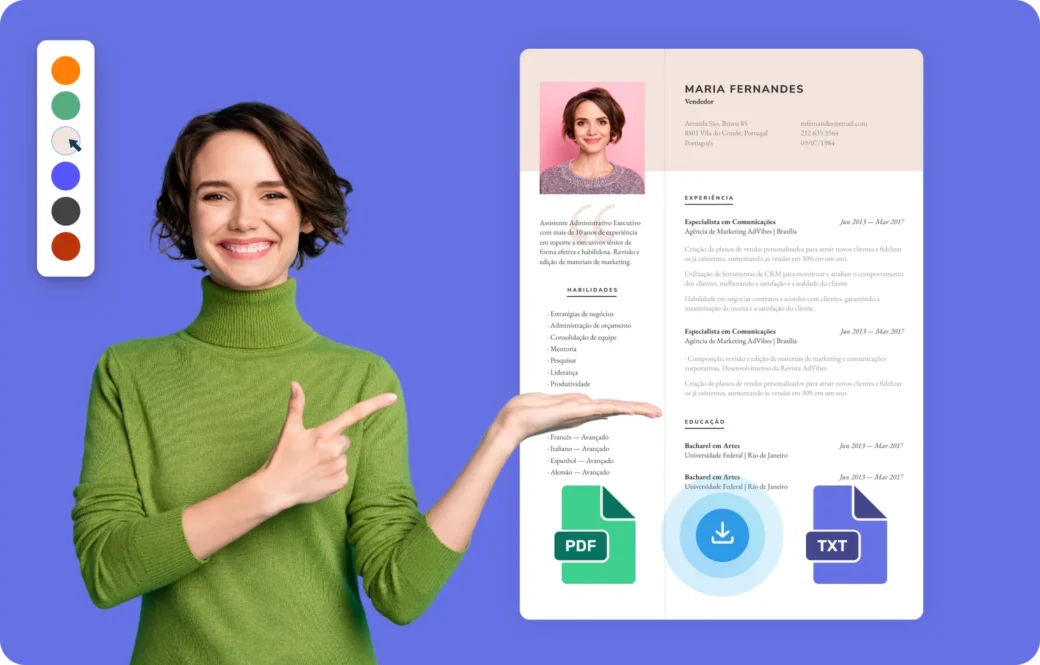 Descubra um jeito descomplicado de destacar seus pontos fortes.Receba convites para entrevistas de emprego e conquiste a contratação dos seus sonhos com nossos recursos intuitivos.