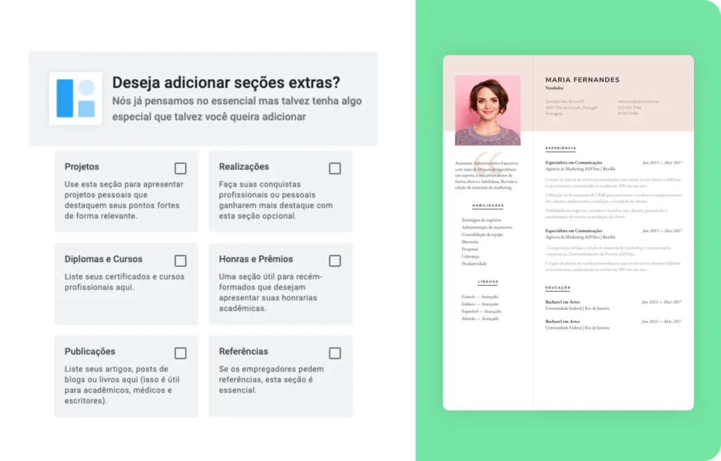 Ajuste as seções, experimente trocar de modelo ou usar outras fontes e cores para deixar o seu currículo com a sua cara.