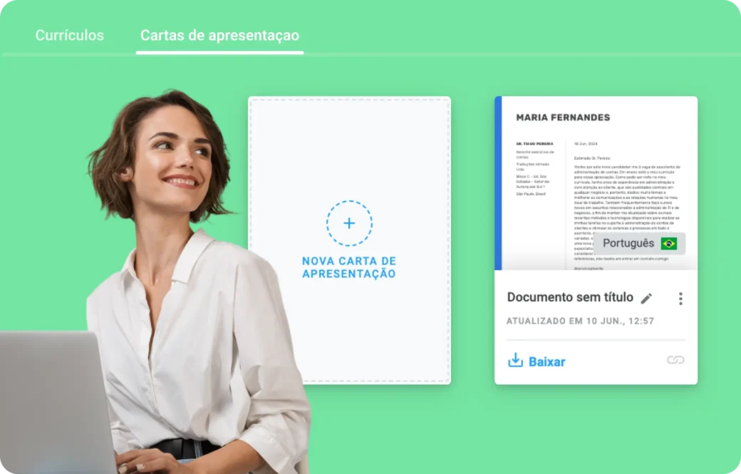 A primeira impressão é a que fica. E, com o nosso editor de cartas de apresentação, você tem o que precisa para fazer com que cada palavra reforce a sua conexão com o cargo que pretende exercer.