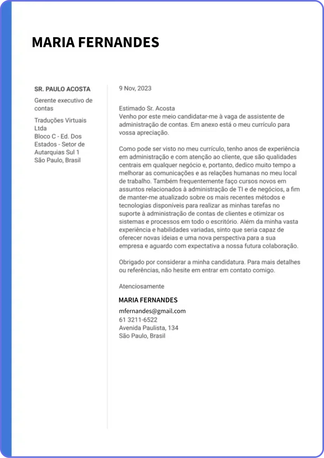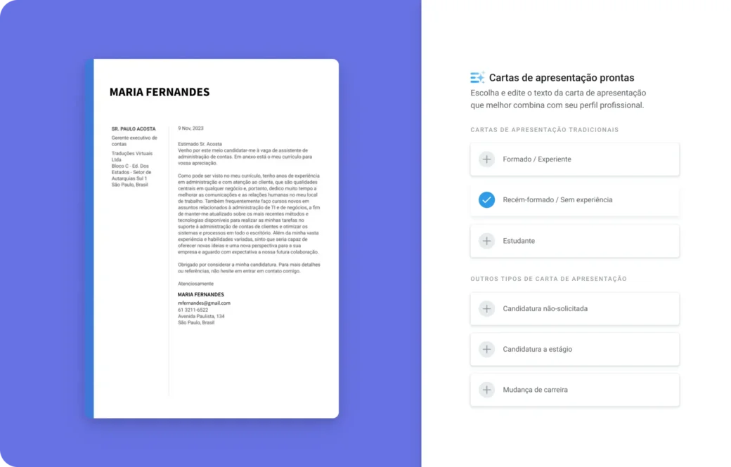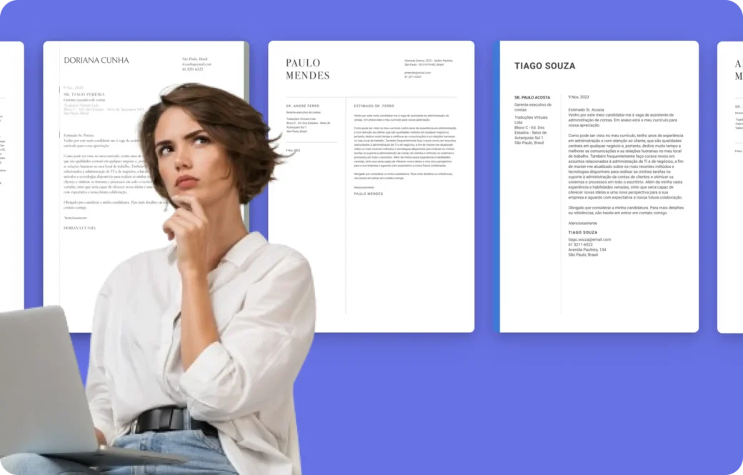 Aproveite os nossos textos pré-escritos como inspiração e personalize para que a carta revele melhor a sua trajetória e aspirações.