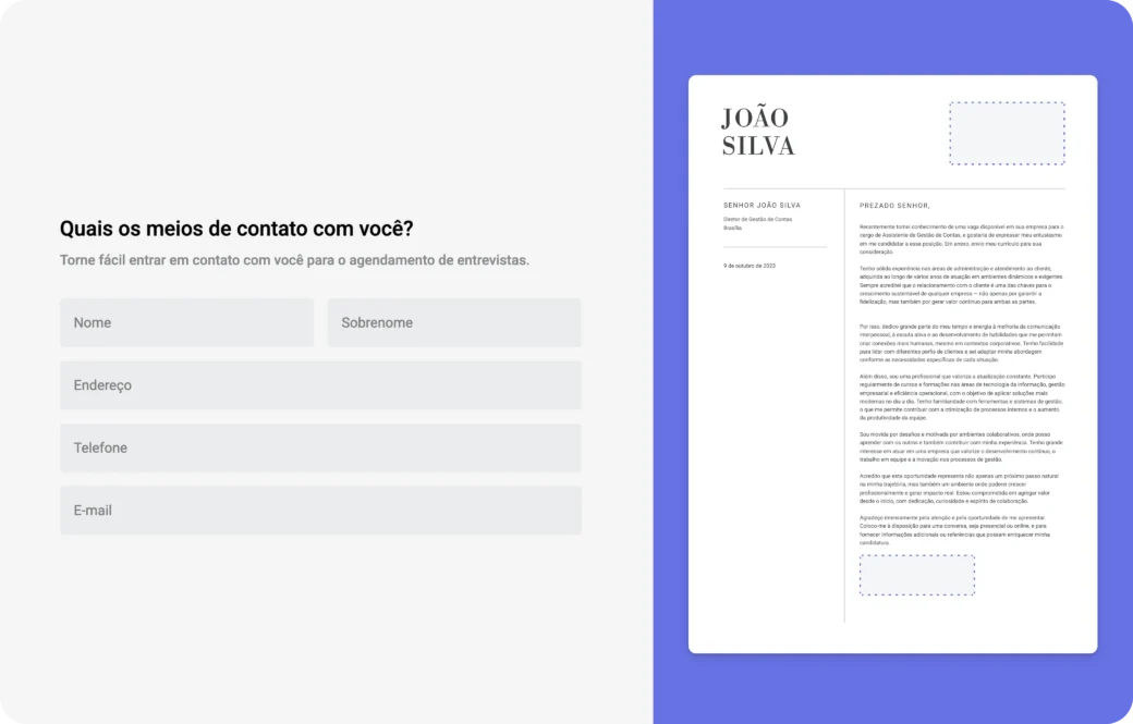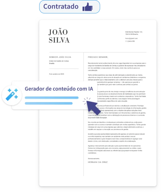 Você pode mencionar o nome da pessoa responsável pelas contratações ou algum detalhe sobre o seu campo de especialização. A ferramenta vai inserir essas informações da melhor maneira para garantir que sua carta fique perfeita.