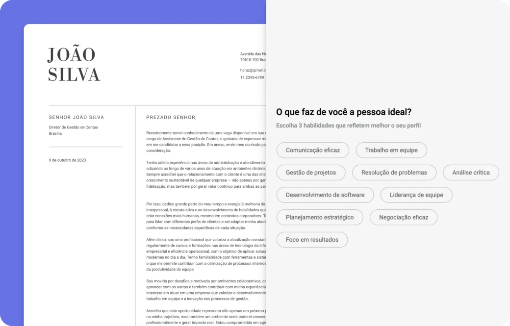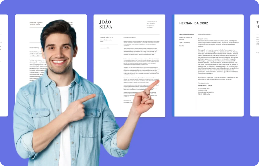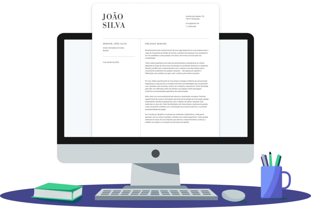 Que tal enviar uma carta de apresentação junto com o currículo? O gerador de cartas de apresentação com IA do OnlineCurriculo cria textos marcantes, que combinam suas qualificações ao tipo de trabalho que você quer desempenhar.