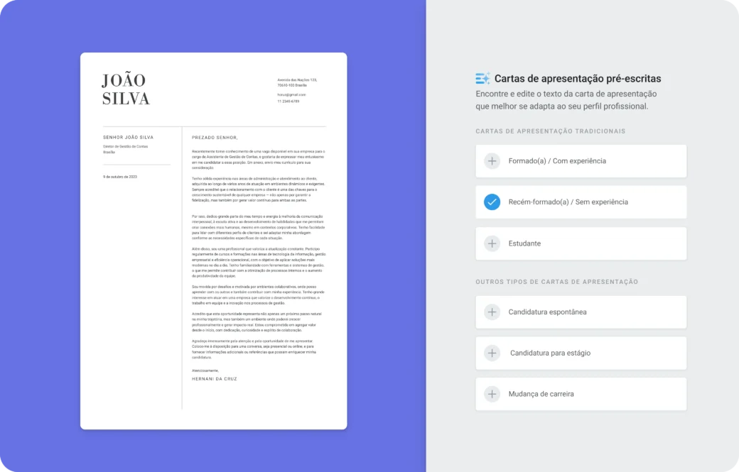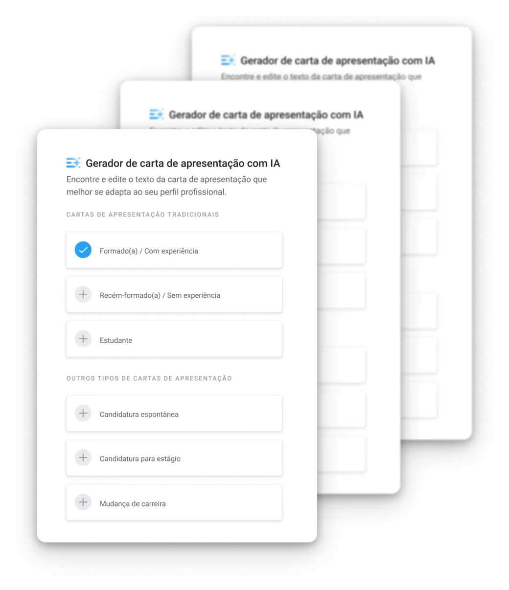 Turbine suas chances com um texto convincente. Crie sua carta profissional na hora, sem estresse.