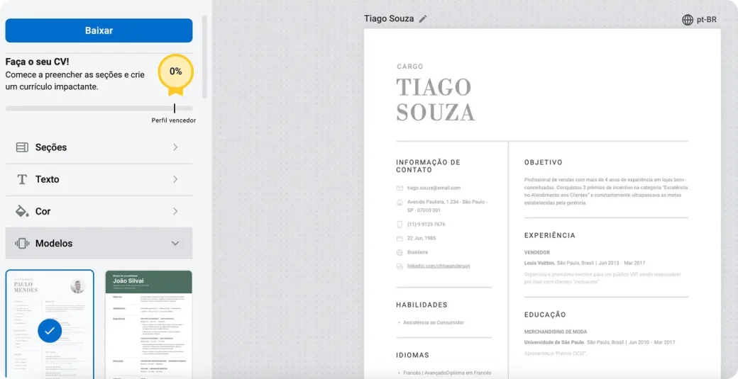 Montar um currículo com visual adequado e conteúdo atraente pode até parecer um desafio. Mas o nosso gerador de currículo é fácil de usar e ajuda você a criar uma incrível apresentação do seu perfil profissional em pouco tempo.