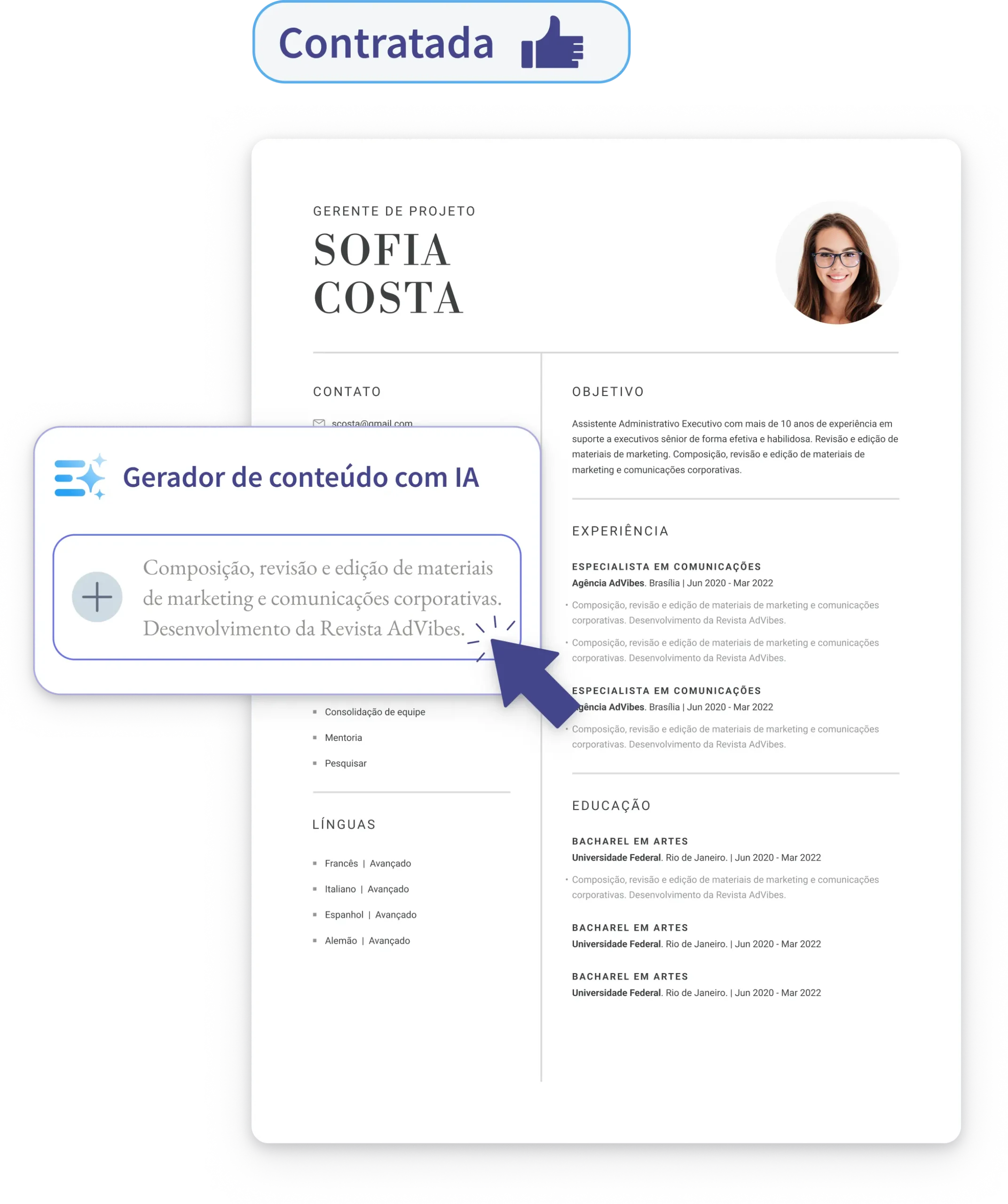 Ele gera um resumo atraente e relevante para o cargo desejado — com base no seu histórico de experiências, qualificações e habilidades que merecem destaque no seu currículo. Em questão de segundos, sua introdução personalizada fica pronta para chamar atenção e mostrar por que vale a pena contratar você. Além disso, você pode usar esse recurso ao escrever o objetivo do CV. currículo.