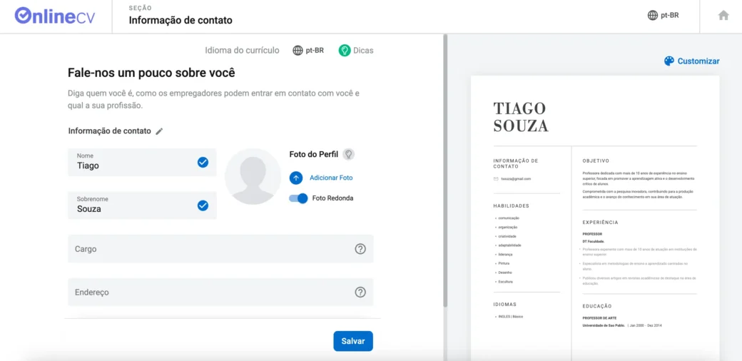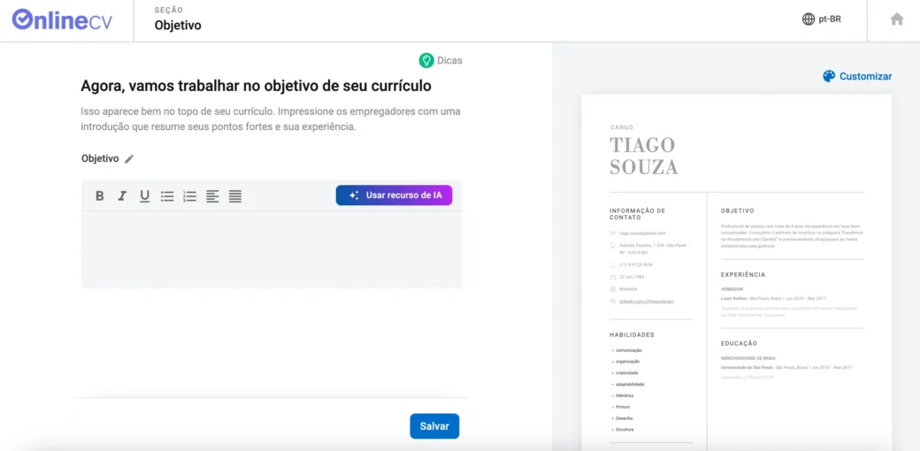Comece inserindo suas informações de contato, experiência profissional, escolaridade, habilidades e idiomas no OnlineCurriculo. Ao concluir essa etapa, nosso gerador com IA vai levar você para a seção do resumo.