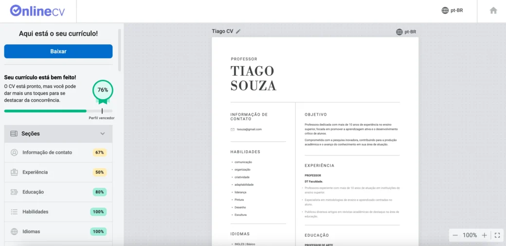 Faça alterações direto no gerador de um modo simples e intuitivo. Edite o texto, enfatize suas conquistas e controle sua maneira de se apresentar às empresas.